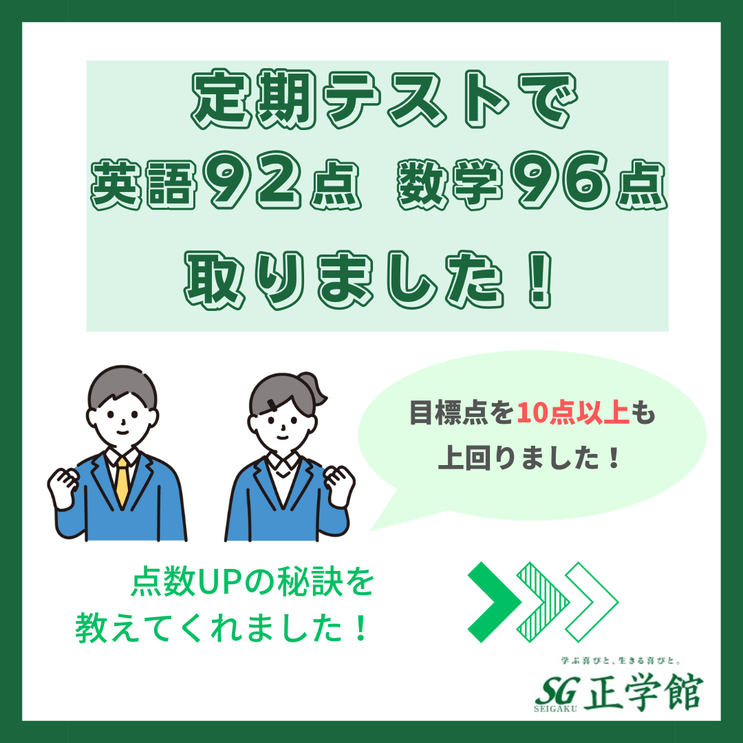 正学館海神行田校 S高校1年生 Mくん 目標点:英語【 80 点 】数学【 80点 】達成!!✨✨テスト時期:【 2023年 5月 】 ■ 正学館に入会したのはいつ頃で、入会のきっかけはどうしてですか? 中1の秋頃で、定期テストの点数が良くなかったからです。 ...
