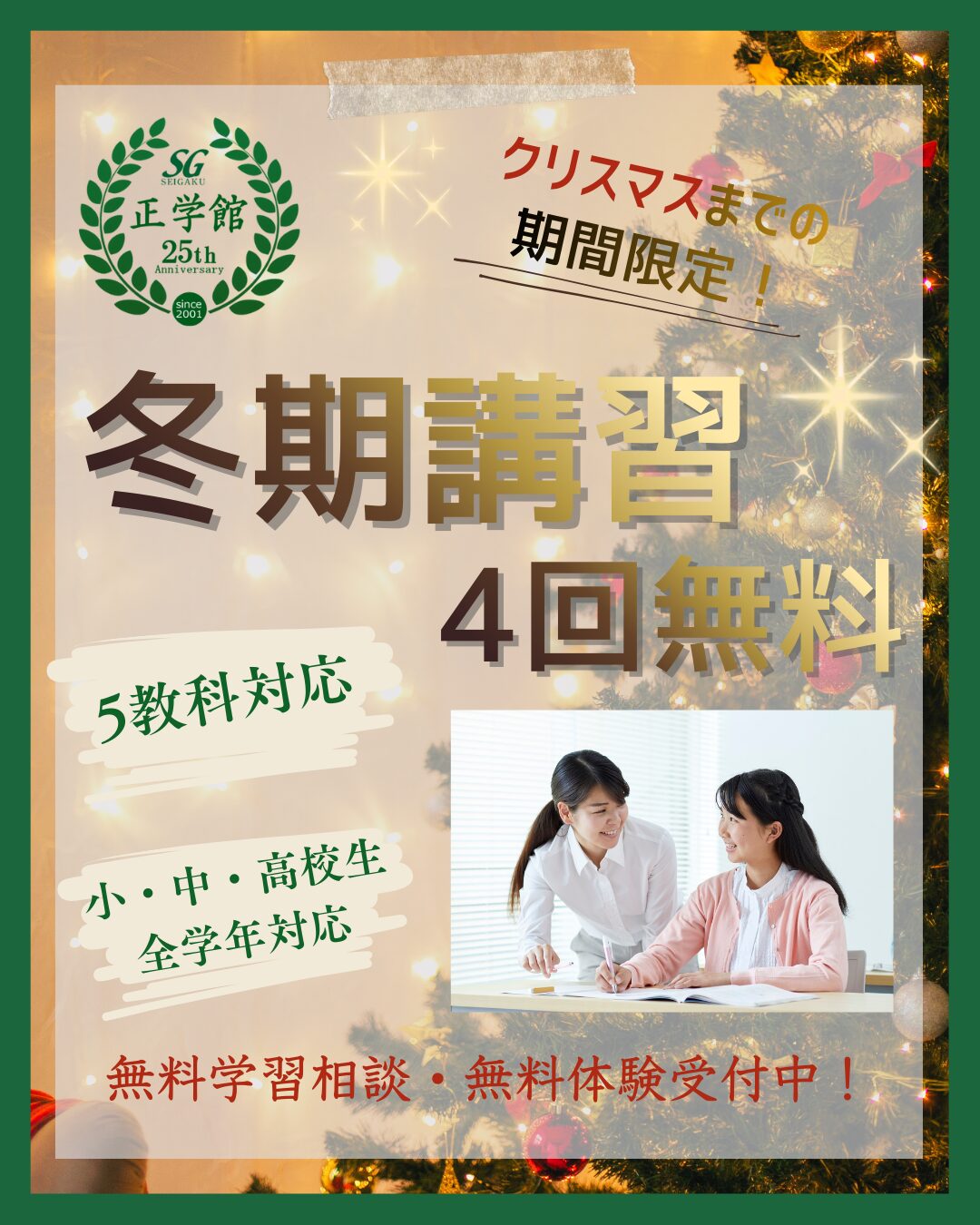 【2025年度 冬期講習のご案内】 正学館では、2025年12月13日(土)〜2026年1月5日(月)の期間で冬期講習を実施いたします。冬休みは、これまでの学習内容を整理し、苦手を解消し、新学期のスタートをスムーズにする大切な時期です。 冬期講習がオススメの理...