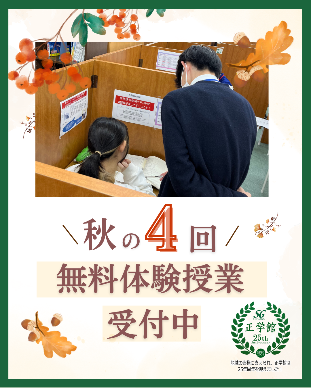 ★2025年秋 無料体験授業4回キャンペーン実施中★ 正学館では通常、新規のお問合せにつき体験授業を1回ご提供しておりますが、小学生・中学生・高校生までの全ての皆さまを対象に無料の体験授業を4回ご提供するキャンペーンを期間限定で実施中です! ●無料体験授業4回...